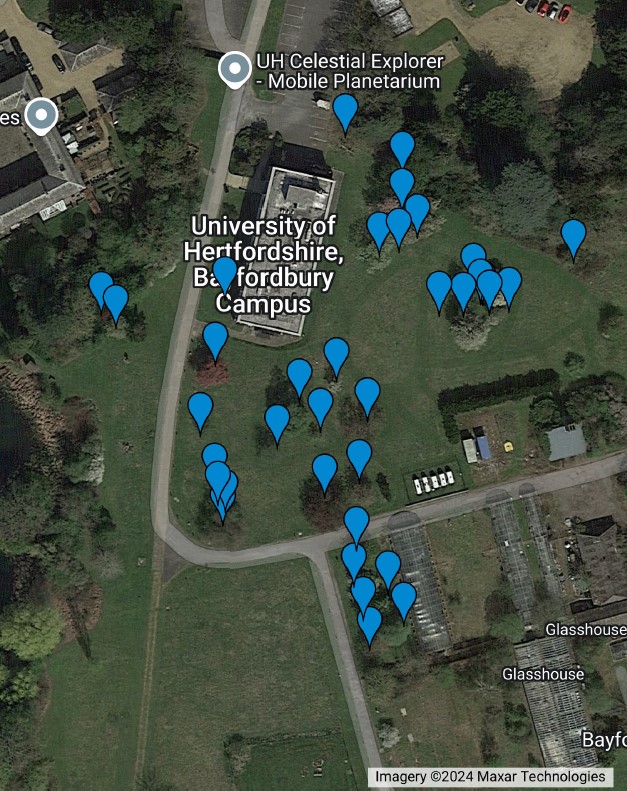 A collection of over 30 ornamental Crab Apple trees of various ages, shapes, flower colours and fruit colour and size. These trees were planted when Bayfordbury was owned by John Innes Institute and provide habitat for invertebrates (including pollinators), birds and a range of epiphytic mosses and lichens. A few trees have been colonised by Mistletoe.