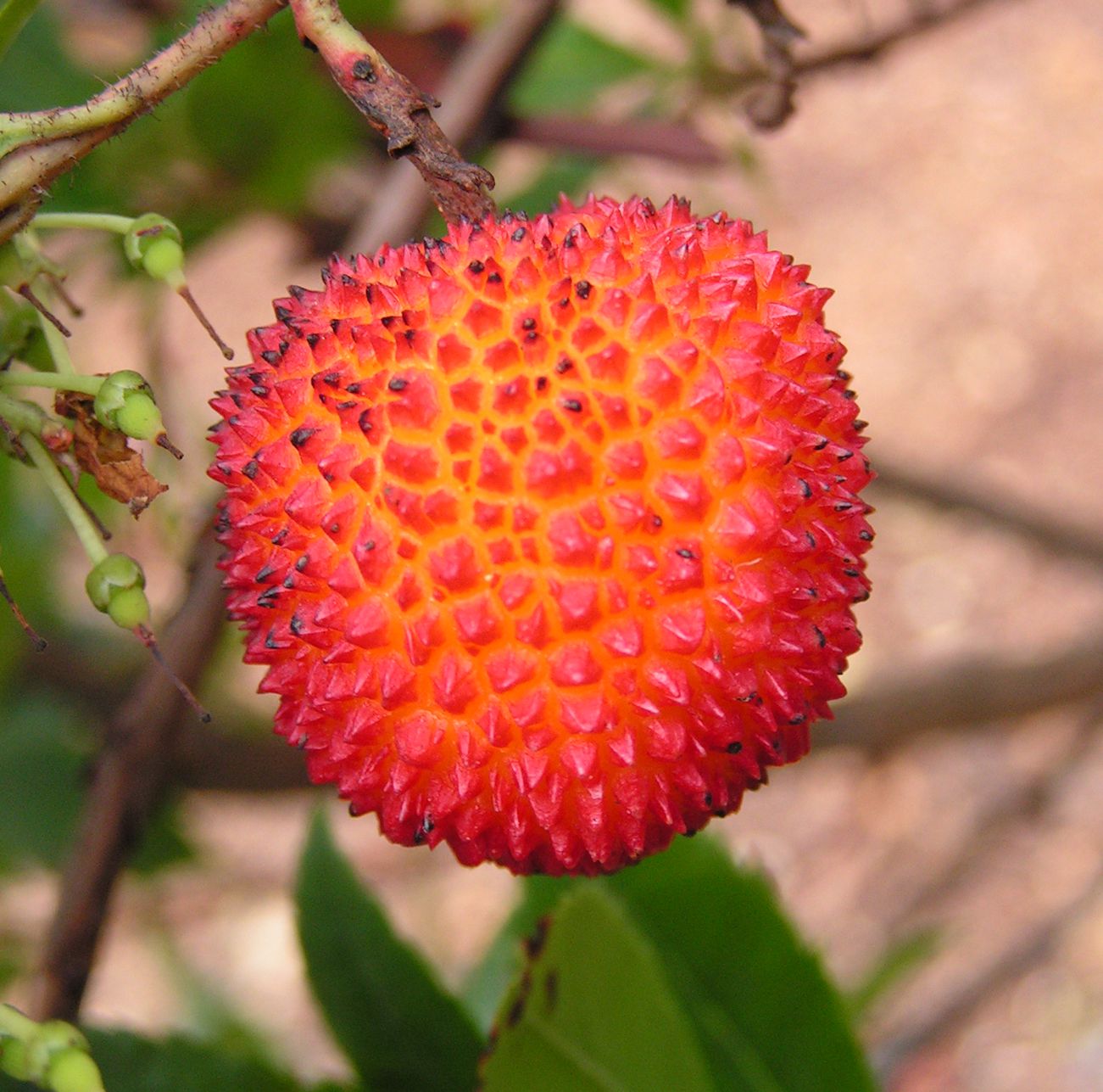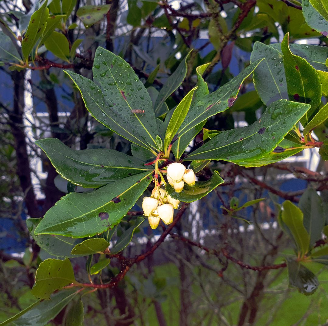 This tree is more commonly seen in the Mediterranean region but is also considered to be native to Ireland. Unusually for plants, this species typically has flowers and fruits at the same time. The fruit, indeed, looks like a strawberry. It is not eaten raw but makes a good jam. The fruit in the image is from the Royal Holloway, University of London campus in Surrey, where a few trees formed a hedge, making it a more sheltered location compared to our tree.