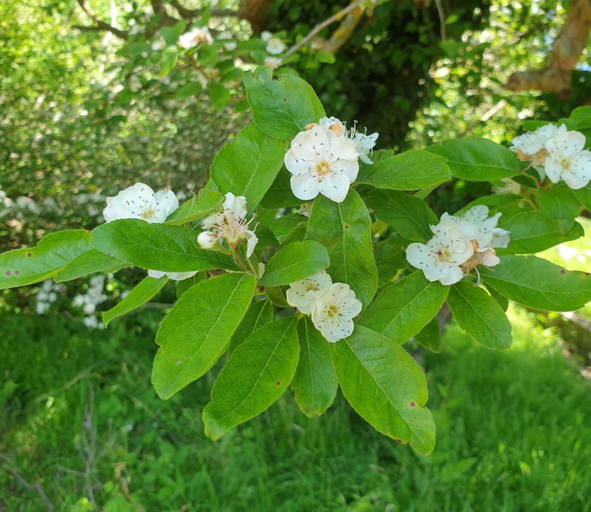 An intergeneric hybrid between Medlar and Midland Hawthorn (Crataegus laevigata). Our tree is very old, but it still produces plenty of flowers. Fruits (not as plentiful) are intermediate between medlars and haws (Hawthorn fruits).