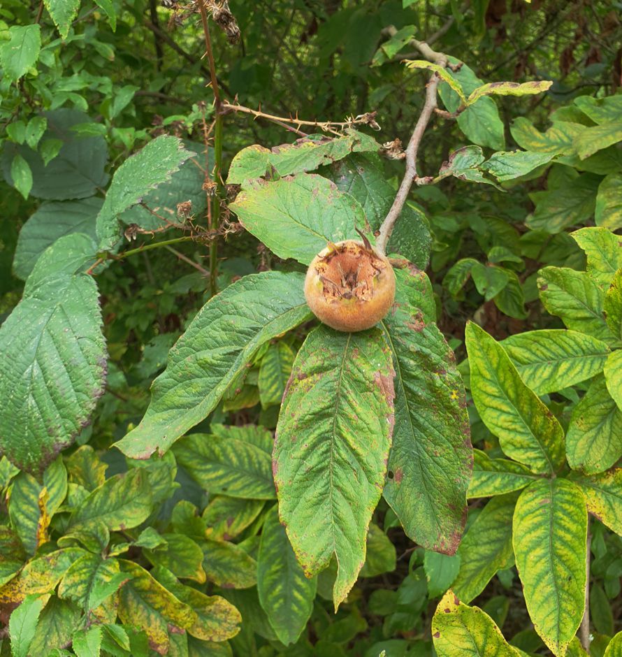 Medlars are relatives of apples and pears and were cultivated for their fruits in the past. The fruits (also called medlars) can only be eaten when fully ripen and after the first frost. Medlars have been replaced by their tastier cousins as fruit trees but remain popular as ornamental trees. Our Medlar was planted at the end of the 20th century to replace an ageing one. Medlars are often grafted on Hawthorn or Pear rootstock. Our tree seems to be grafted on Quince (another old fruit tree close to pears).